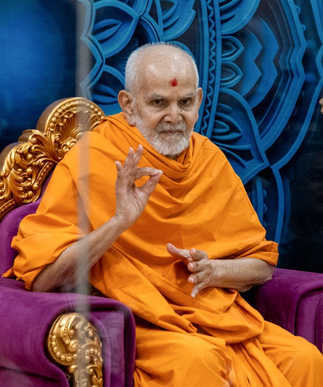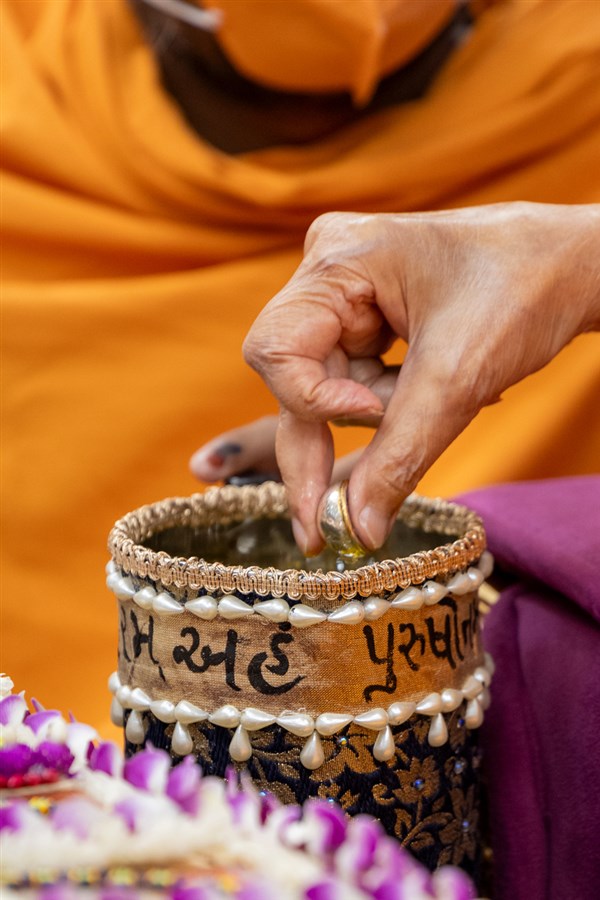 Swamishri sanctifies water with the holy relics of Bhagwan Swaminarayan and the Guru Parampara