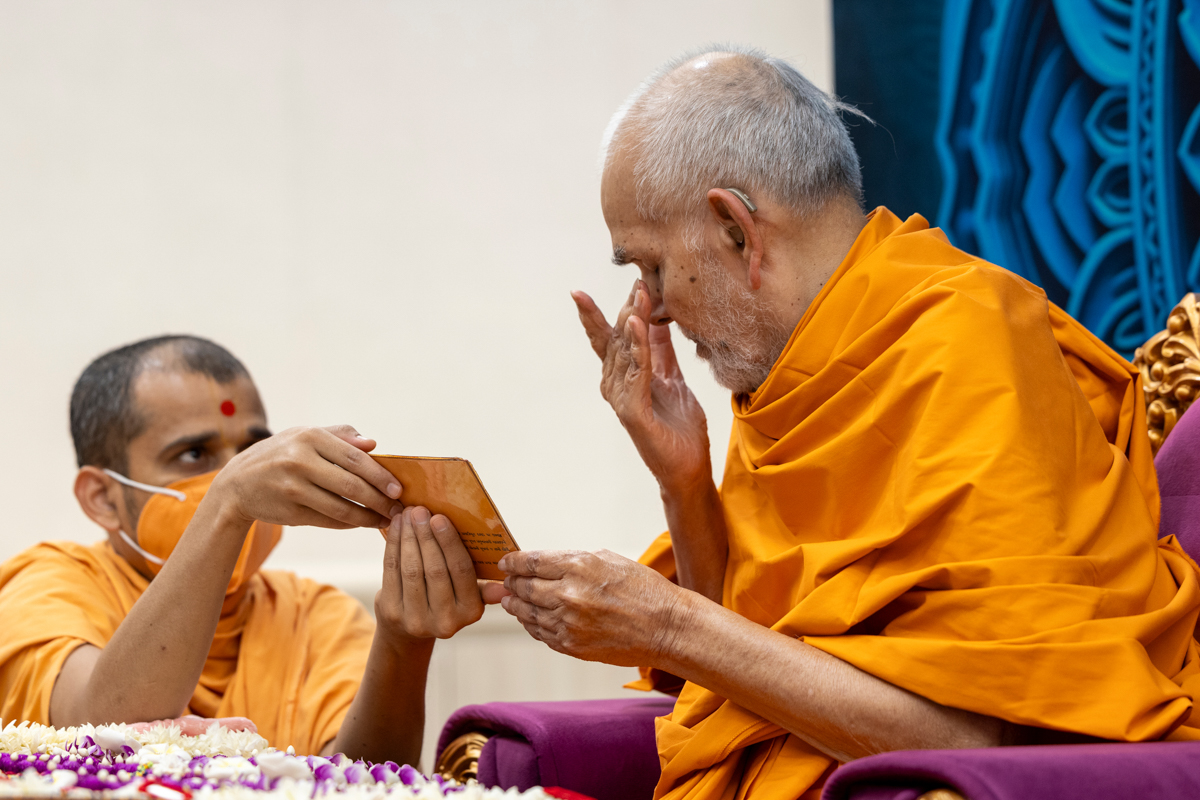 Swamishri touches his eyes after reverently touching the holy charanarvind of Shri Akshar-Purushottam Maharaj