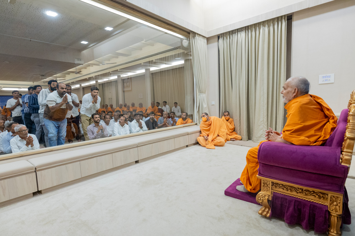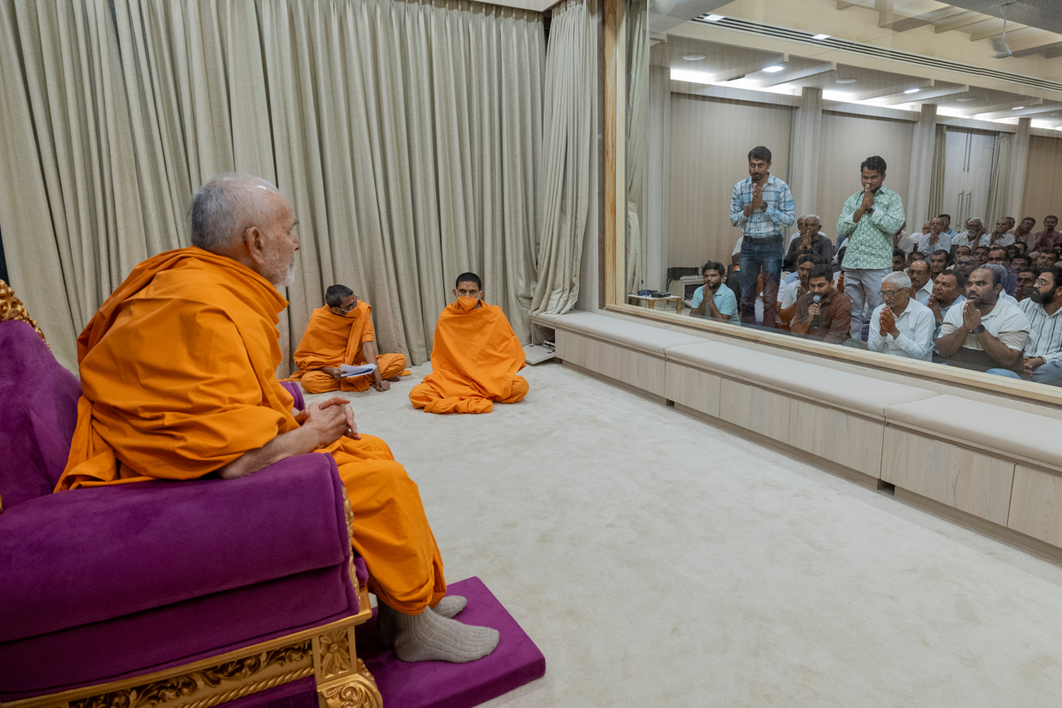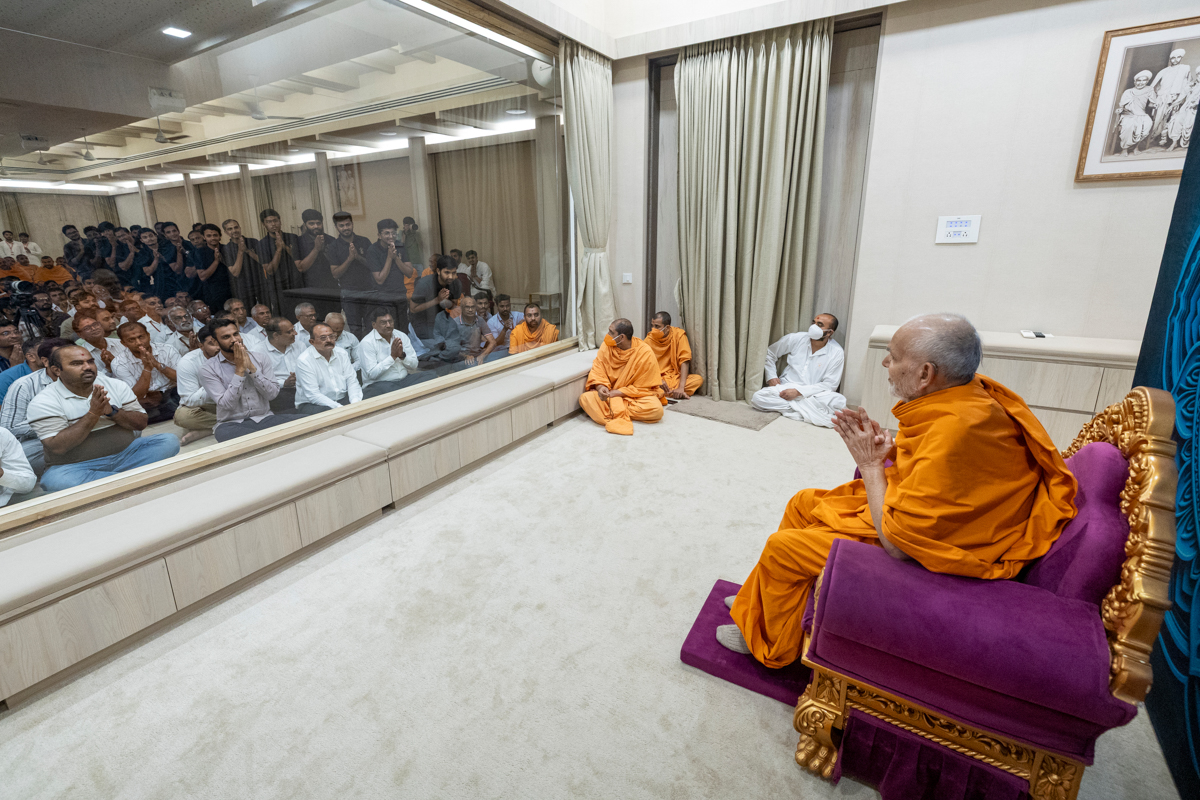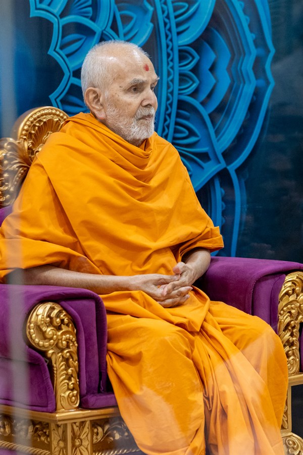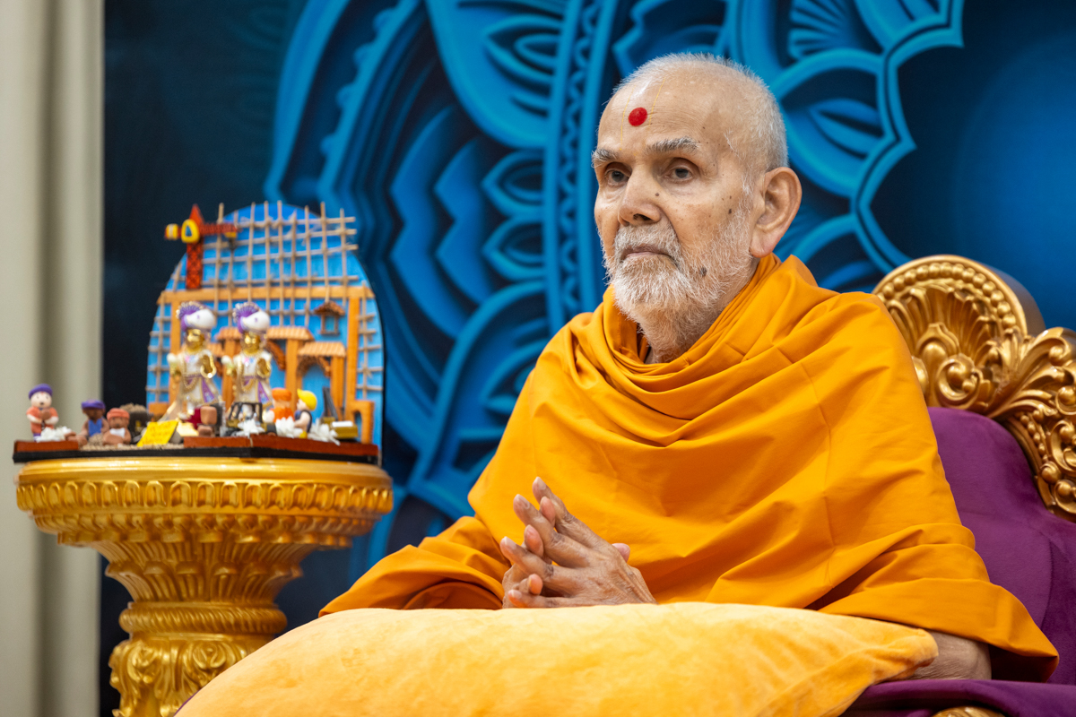 Swamishri engrossed in darshan of Shri Harikrishna Maharaj and Shri Gunatitanand Swami Maharaj