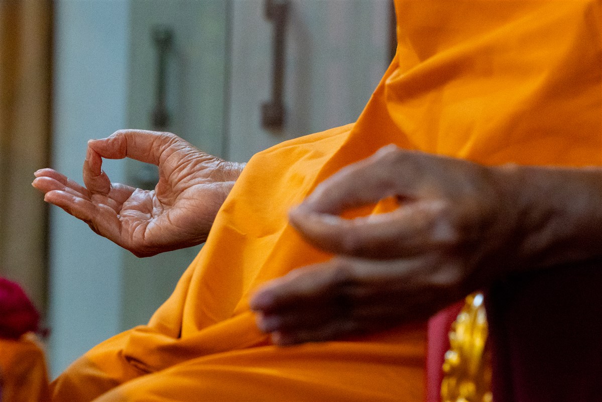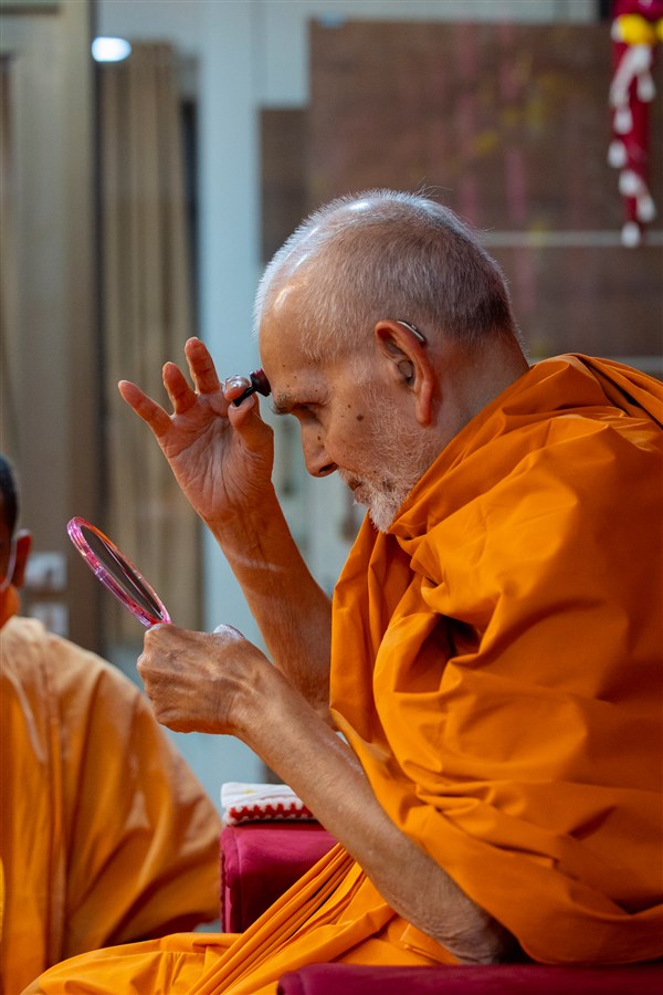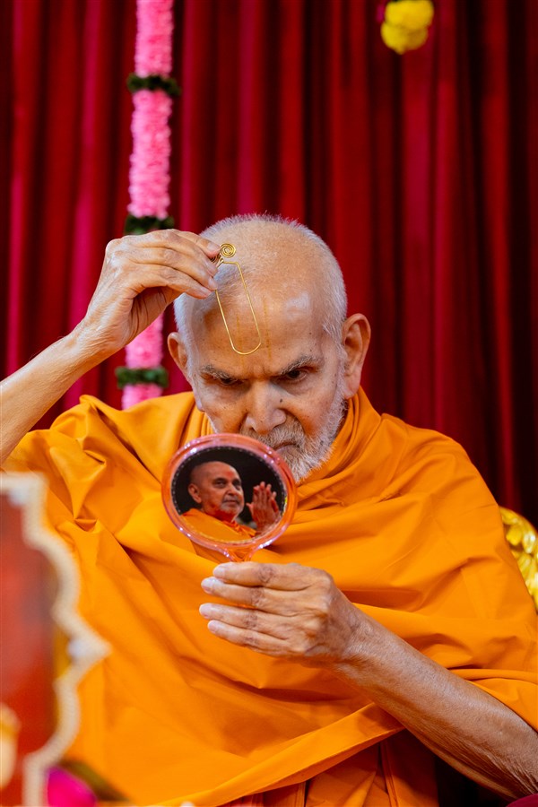 Param Pujya Mahant Swami Maharaj applies a tilak on his forehead