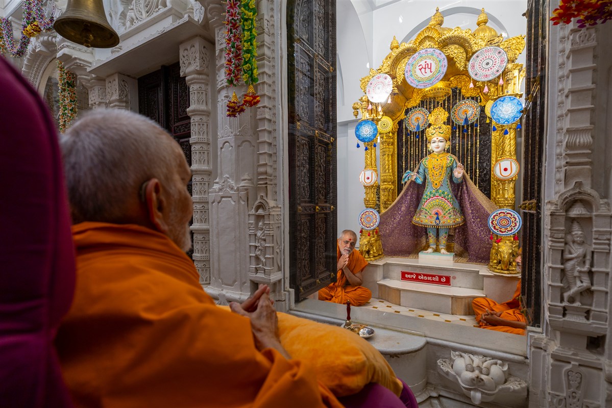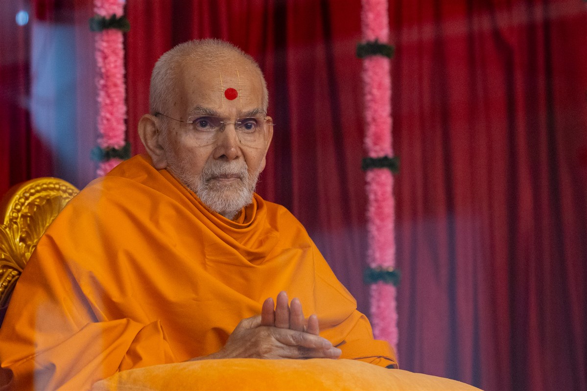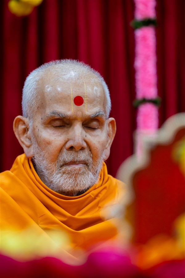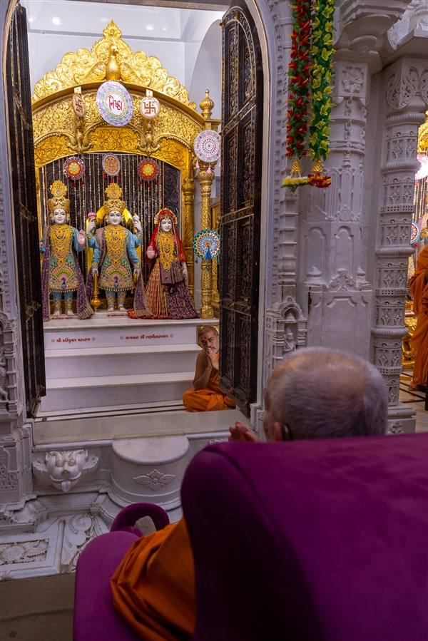 Swamishri engrossed in darshan of Shri Harikrishna Maharaj and Shri Lakshmi-Narayan Bhagwan