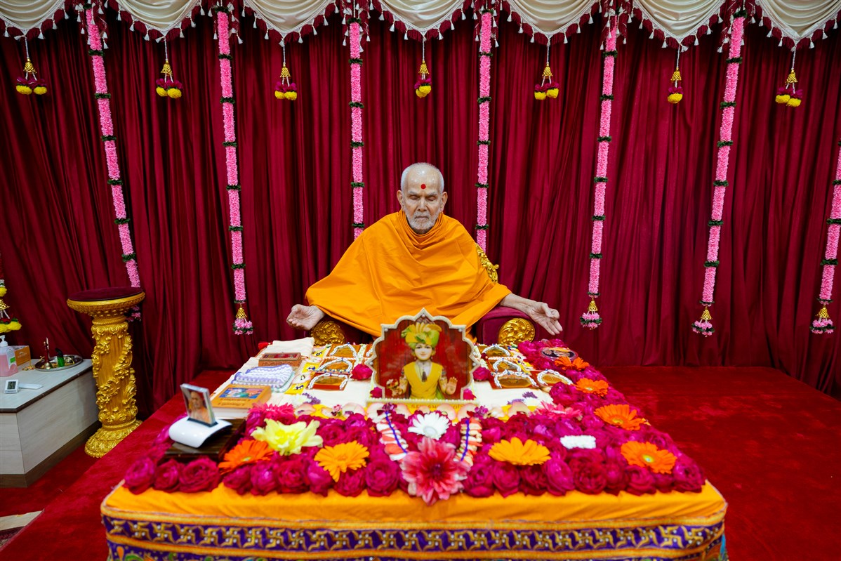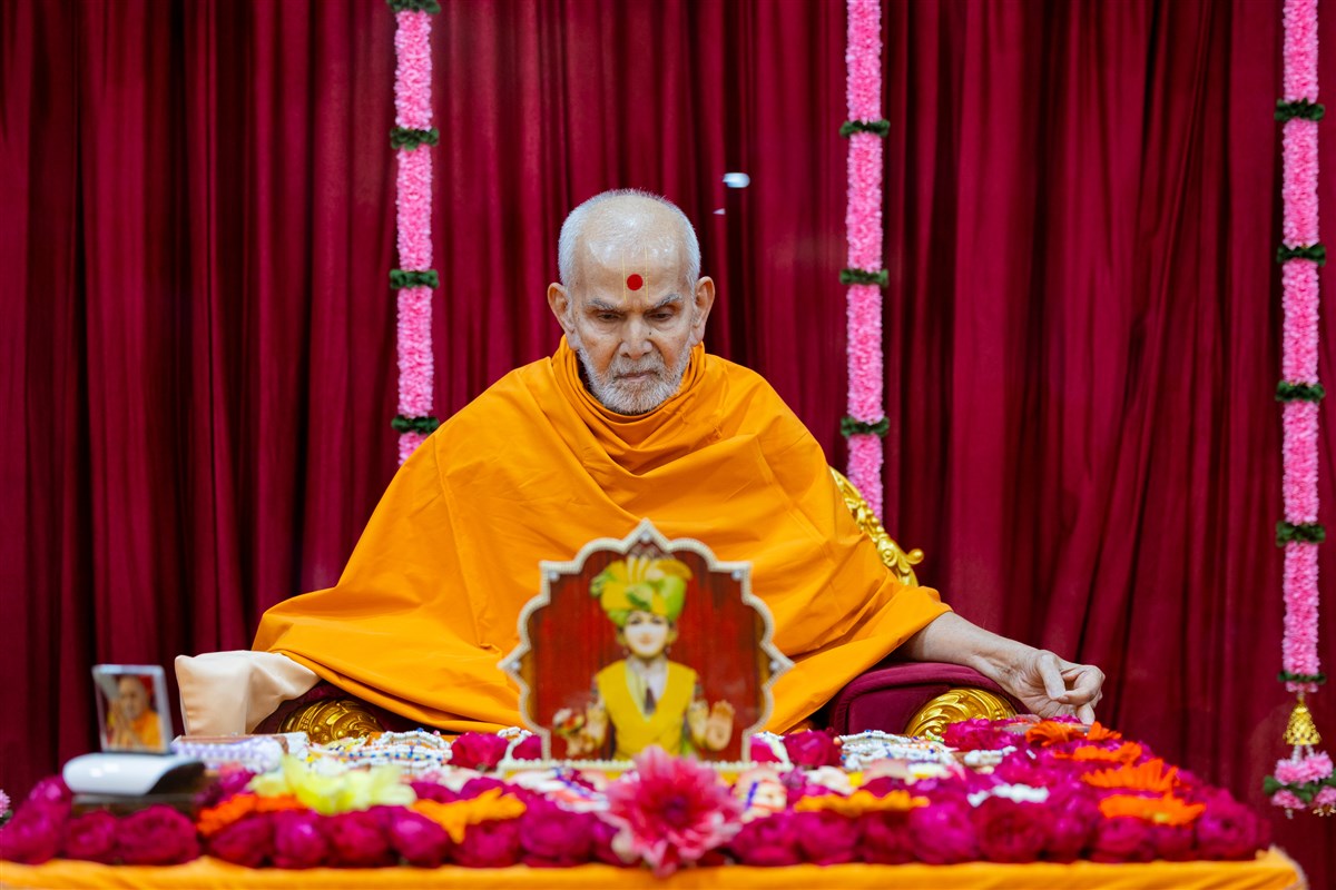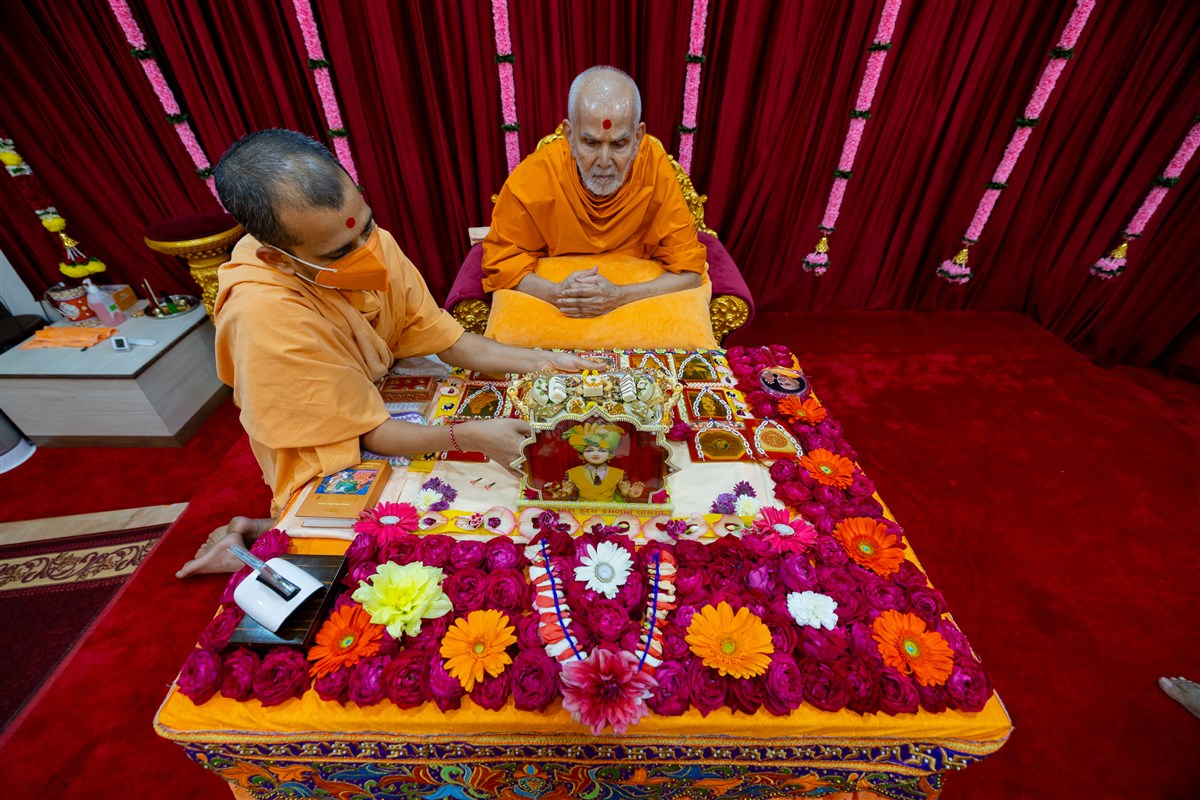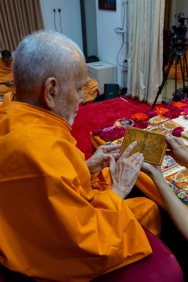 Swamishri engrossed in darshan of Shri Harikrishna Maharaj and Shri Gunatitanand Swami Maharaj