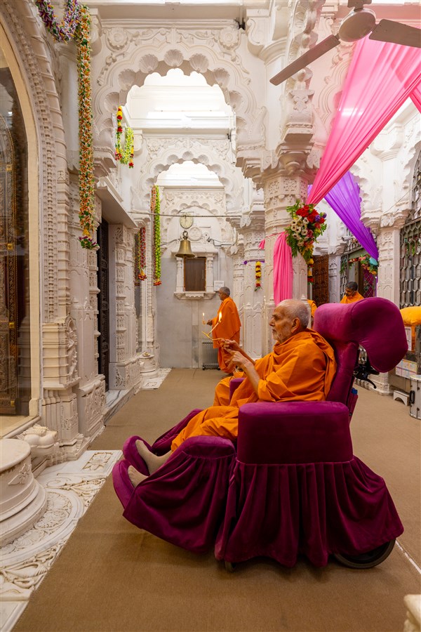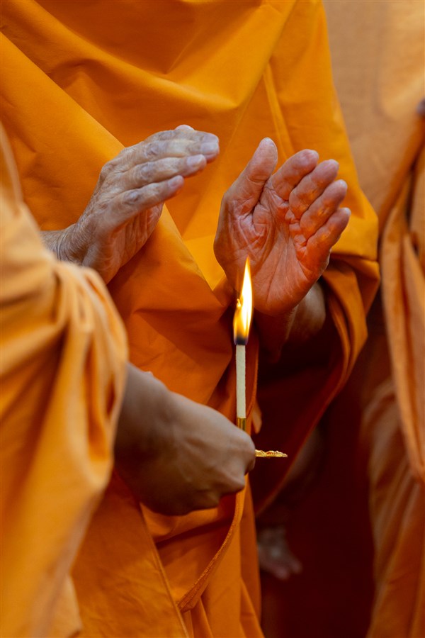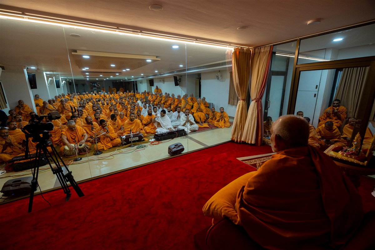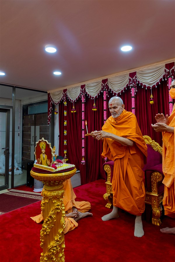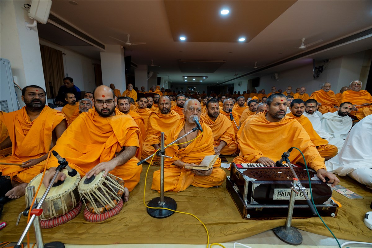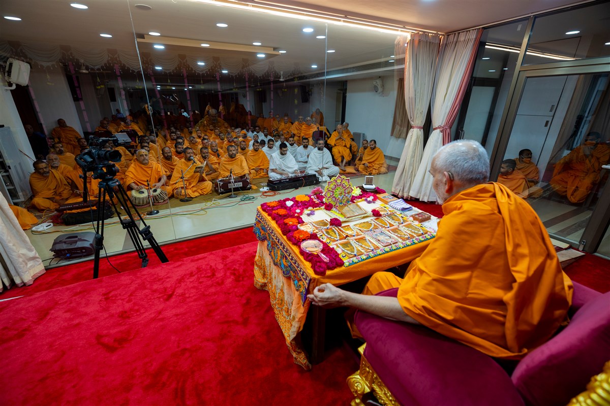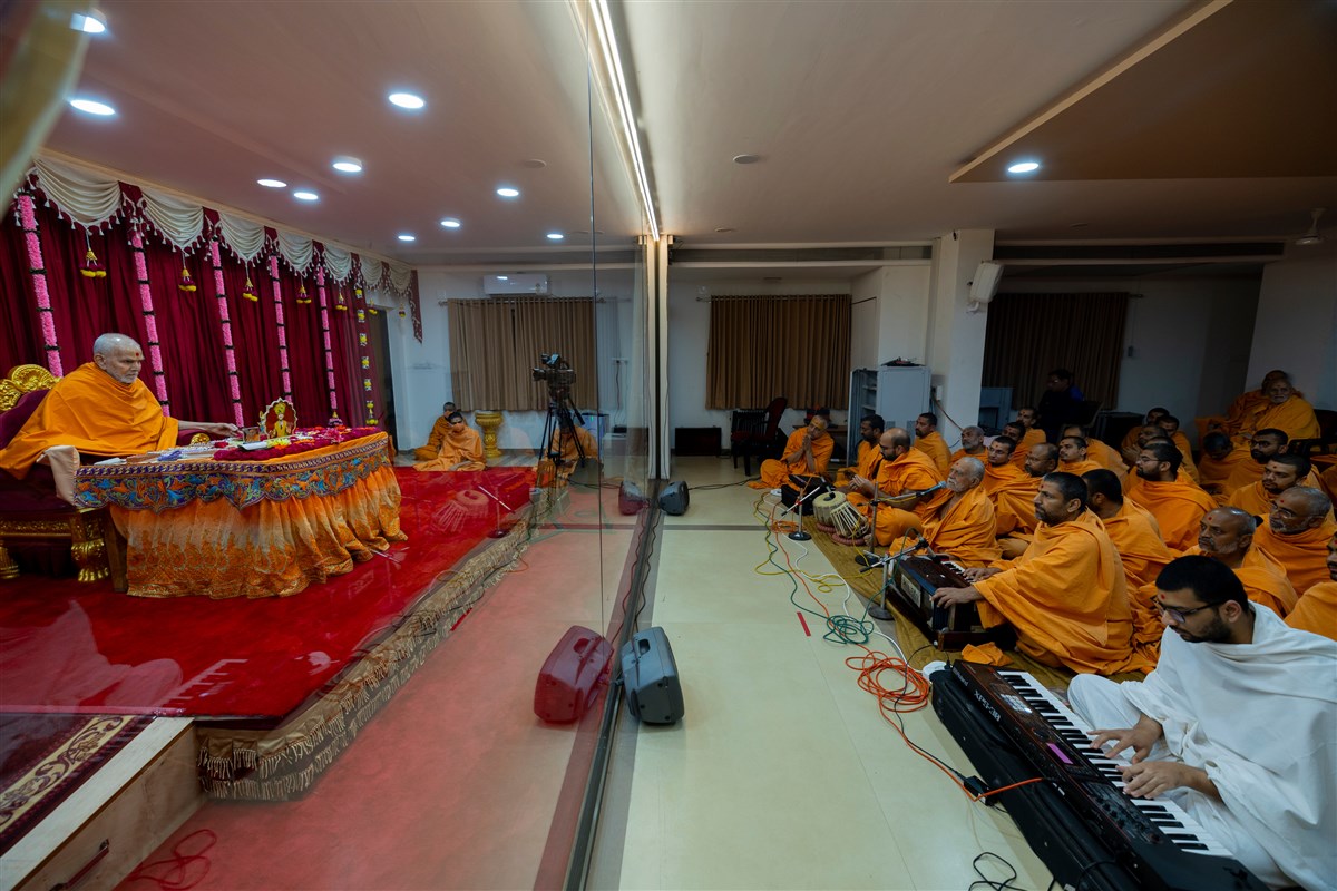 Narayanbhushan Swami sings a kirtan in Swamishri's daily puja