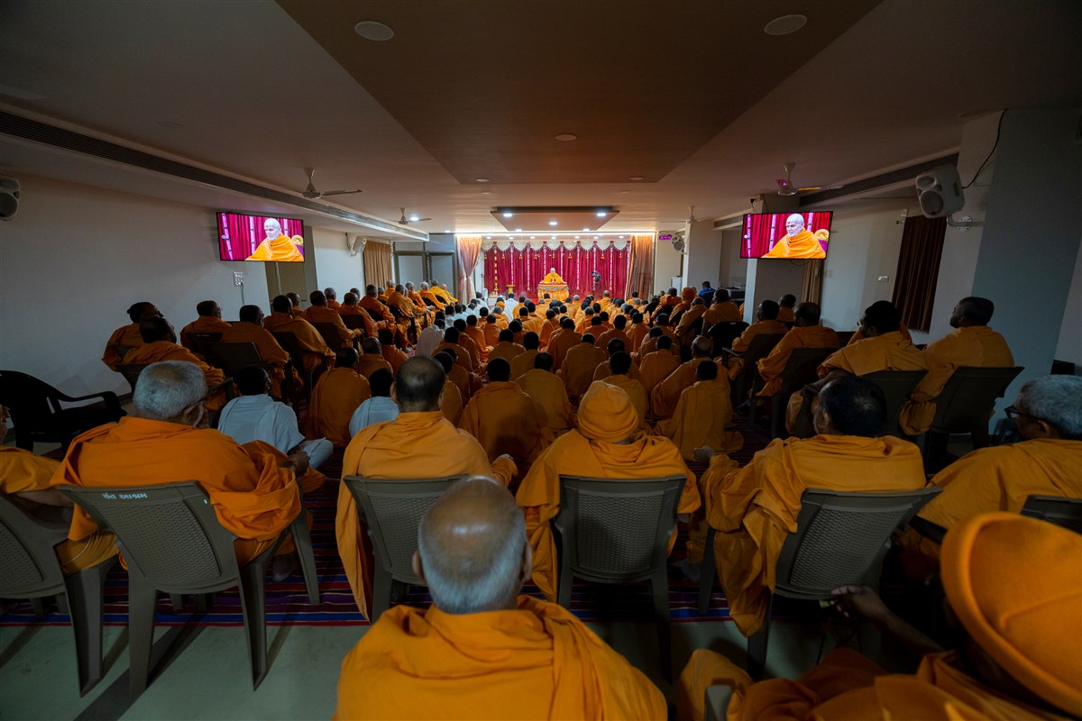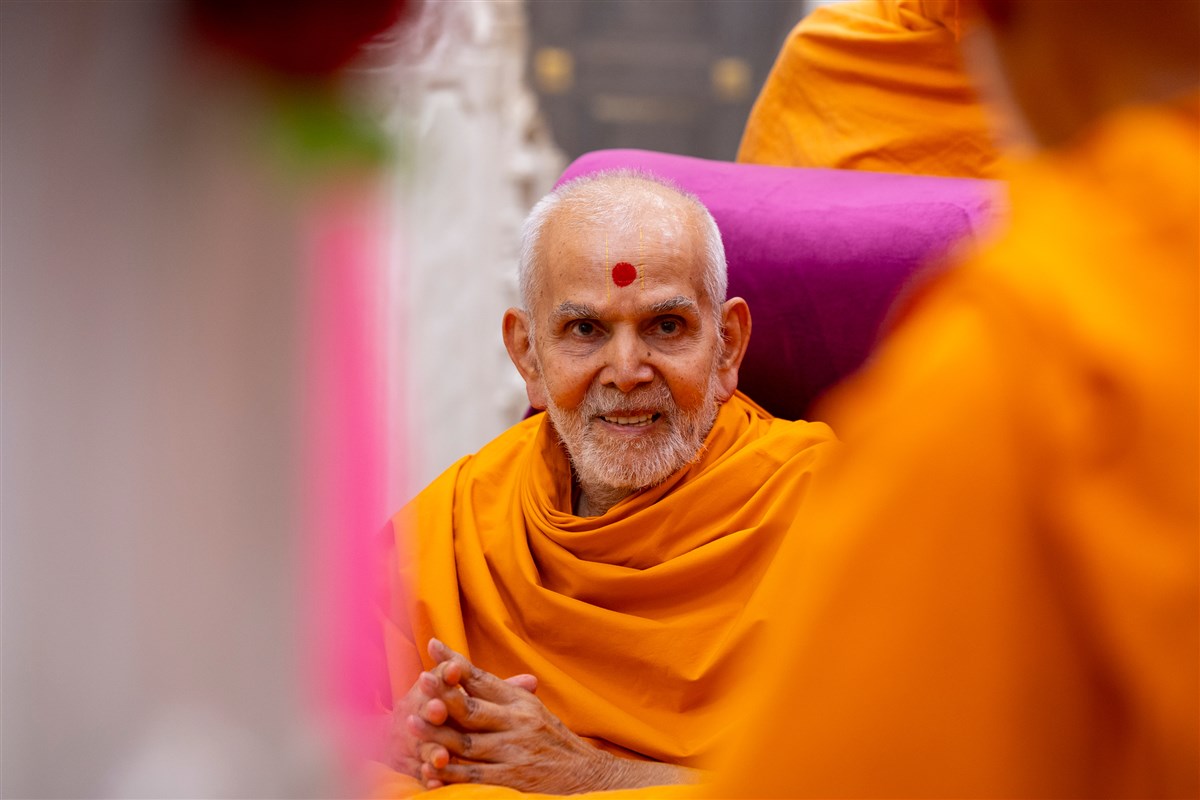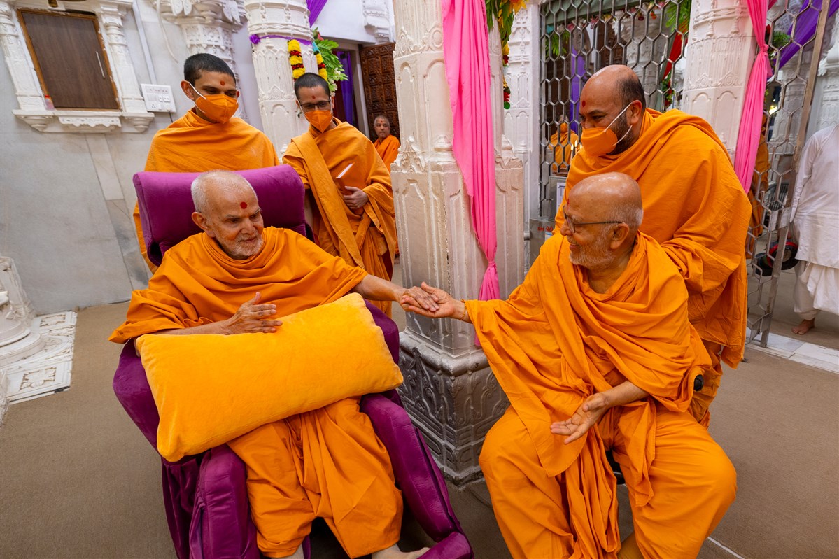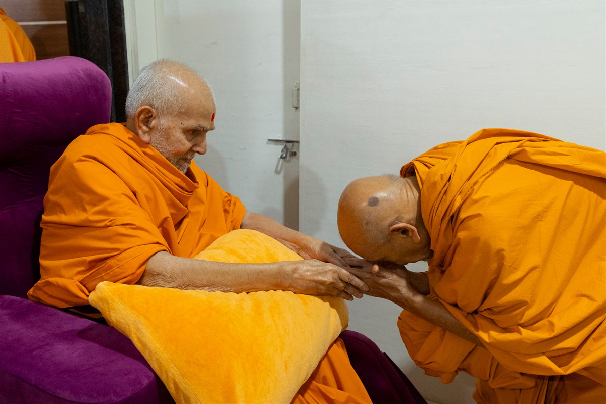 Swamishri greets Pujya Ghanshyamcharan Swami