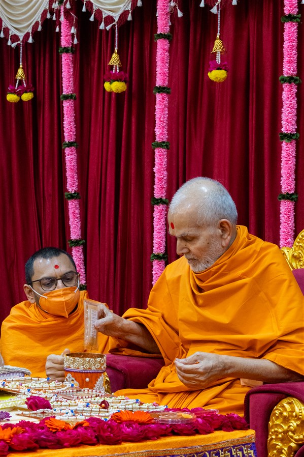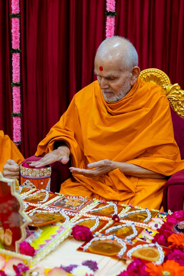 Swamishri sanctifies water with the holy relics of Bhagwan Swaminarayan and the Guru Parampara