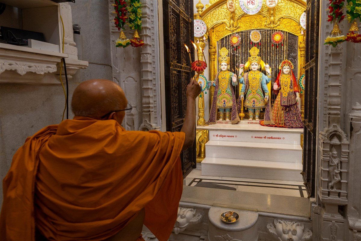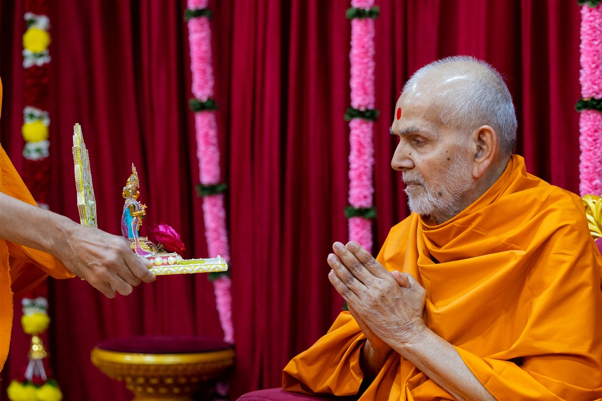 Swamishri offers thal to Shri Harikrishna Maharaj and Shri Gunatitanand Swami Maharaj