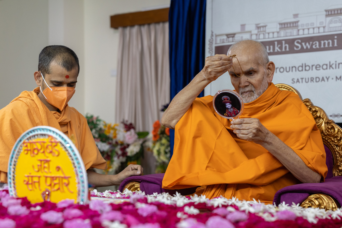 Swamishri adjusts the mirror in his daily puja