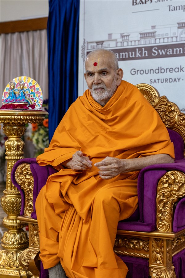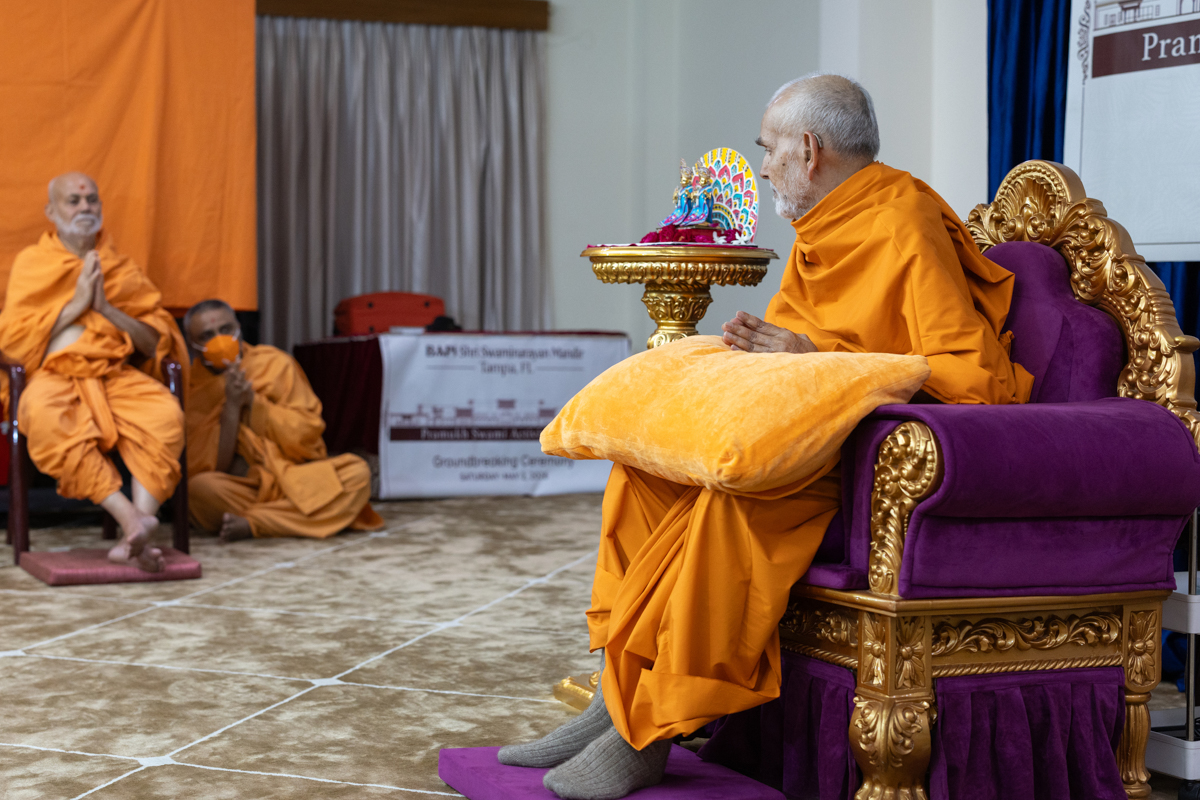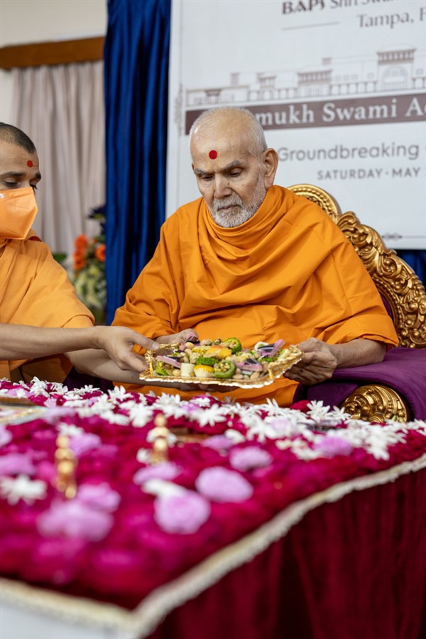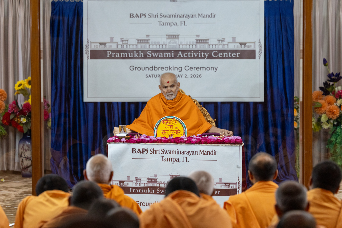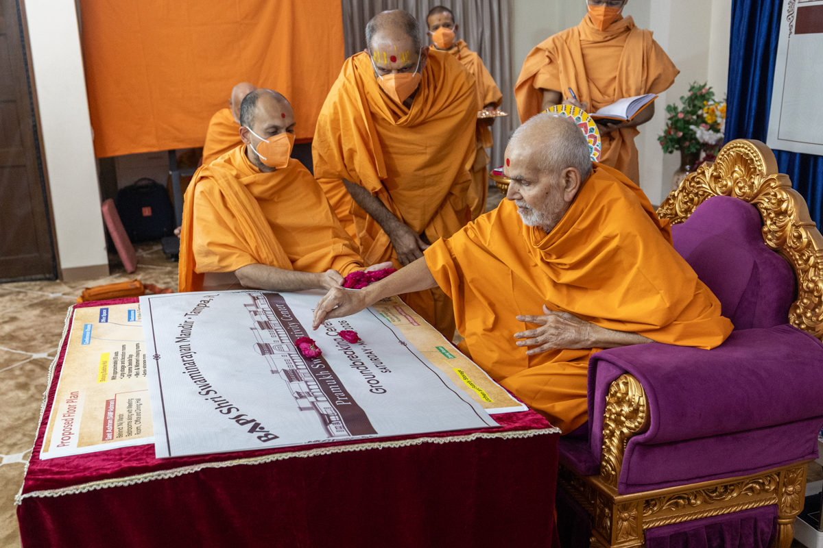 Swamishri sanctifies the plan to start construction of the Pramukh Swami Activity Center at BAPS Shri Swaminarayan Mandir, Tampa, FL, USA
