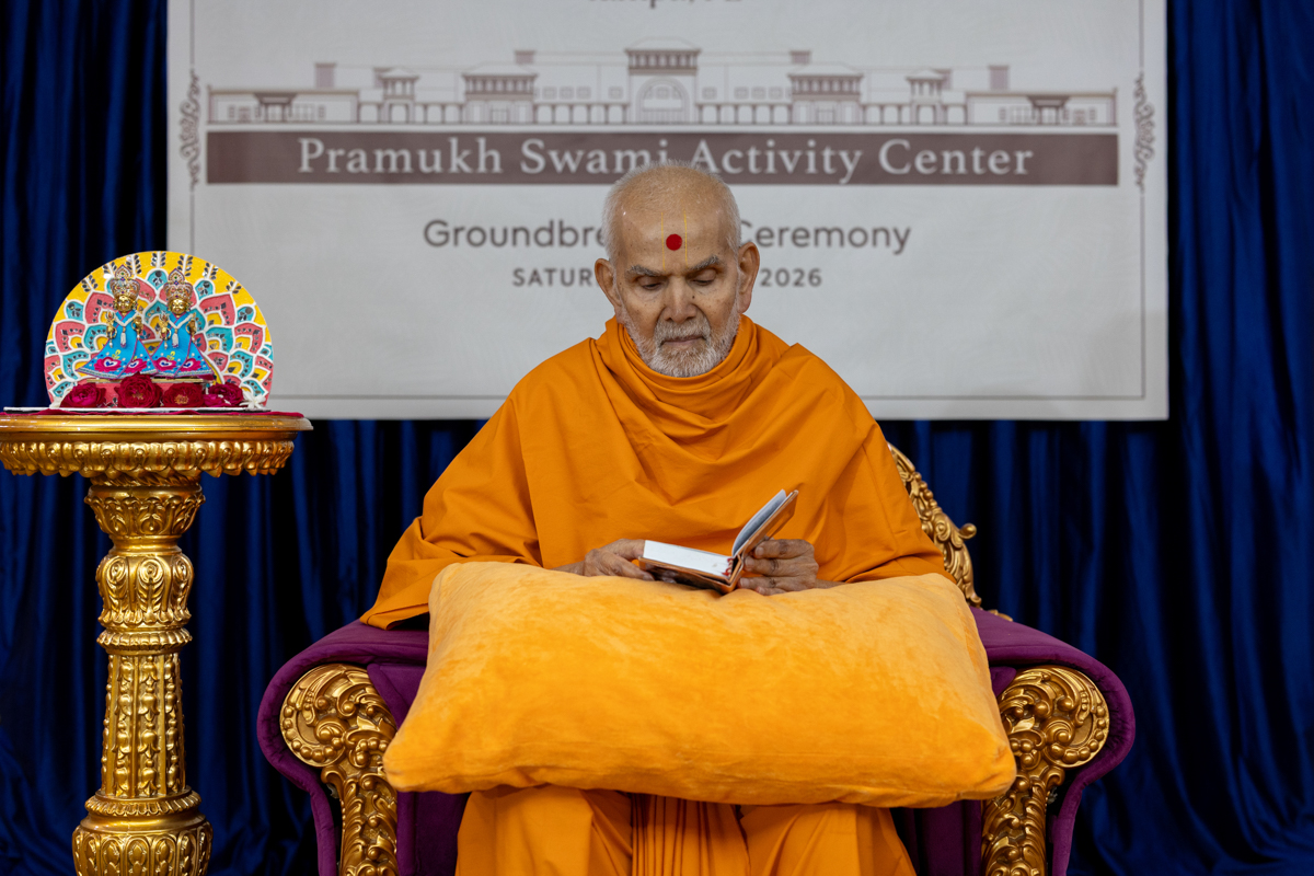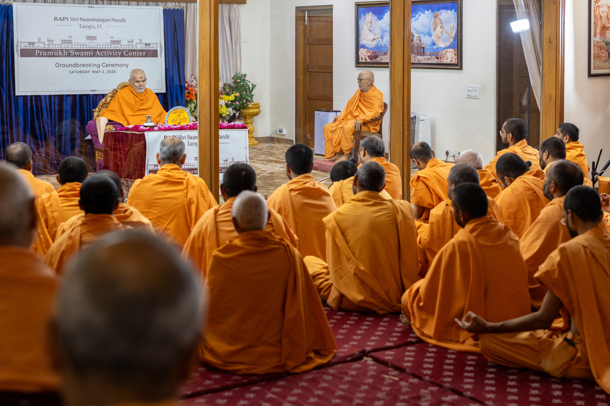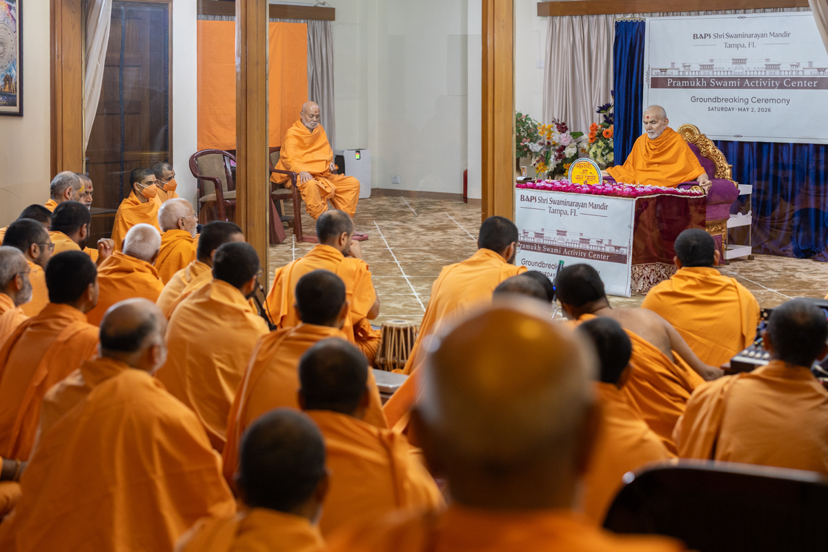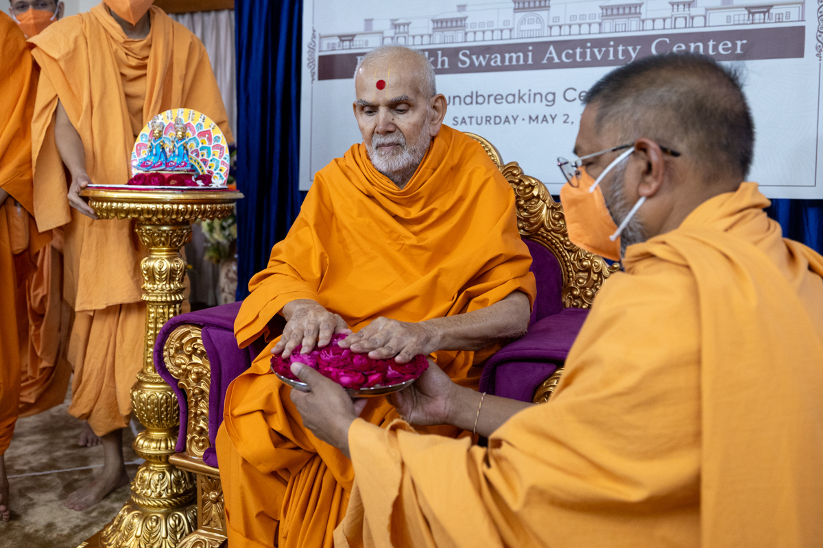 Swamishri sanctifies the plan to start construction of the Pramukh Swami Activity Center at BAPS Shri Swaminarayan Mandir, Tampa, FL, USA