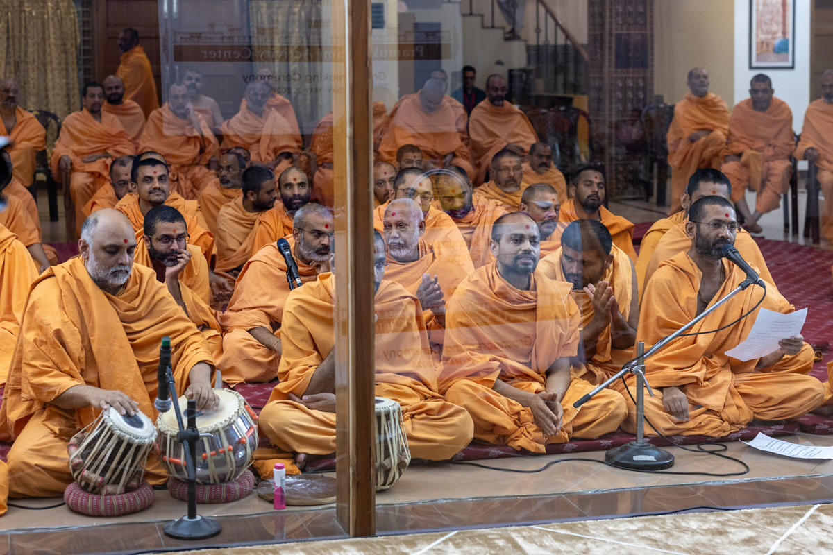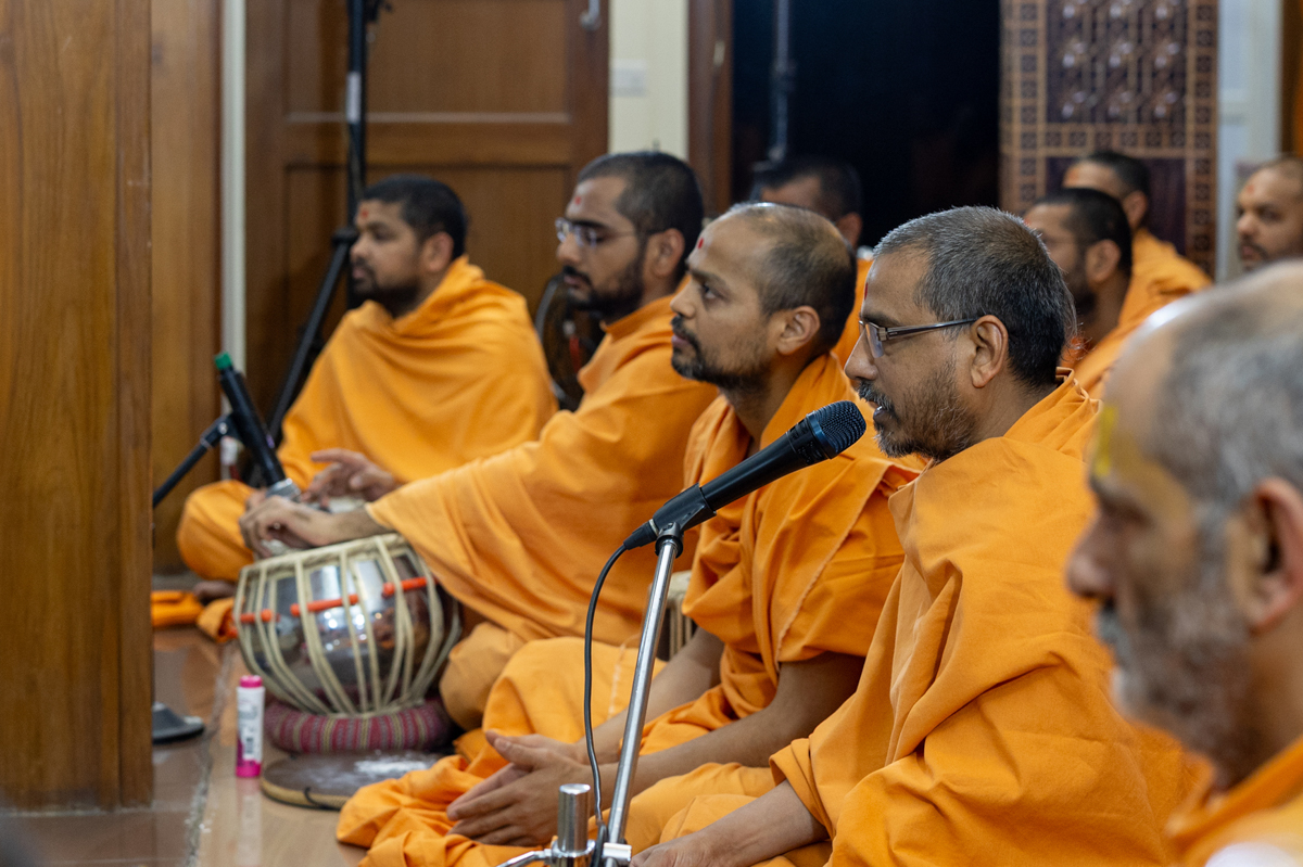 A swami sings a kirtan in Swamishri's daily puja
