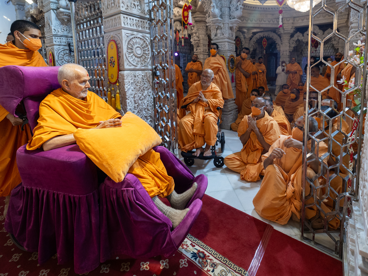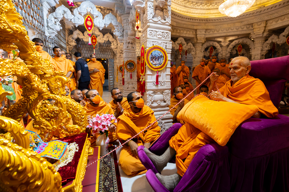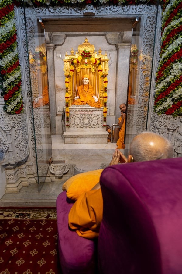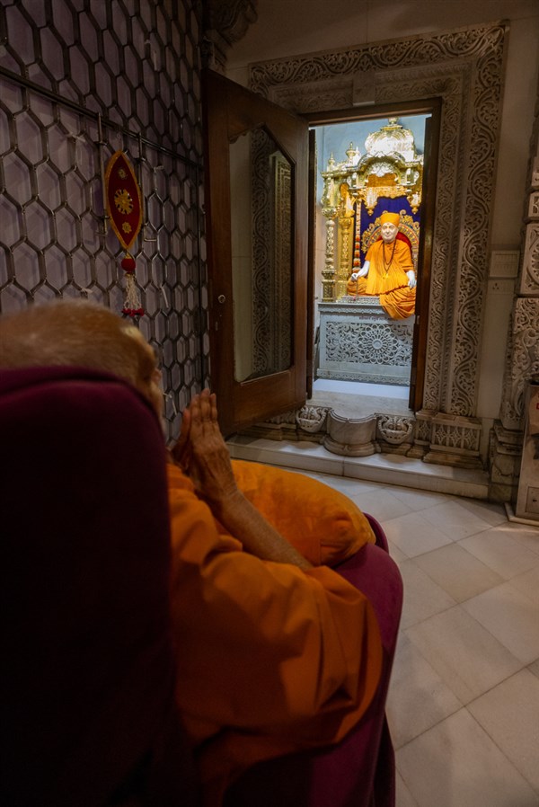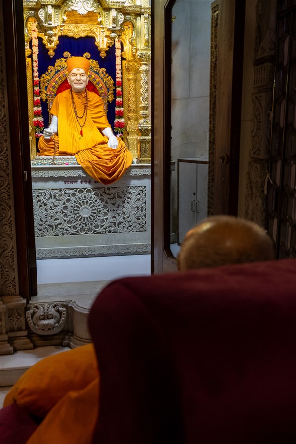 Swamishri arrives for Thakorji's darshan