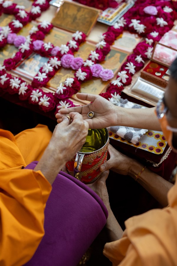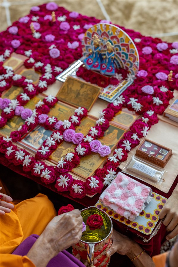 Swamishri adds flowers to the sanctified water