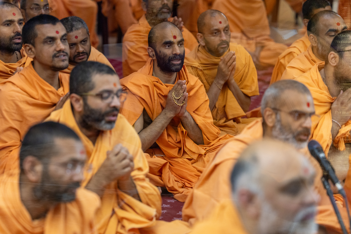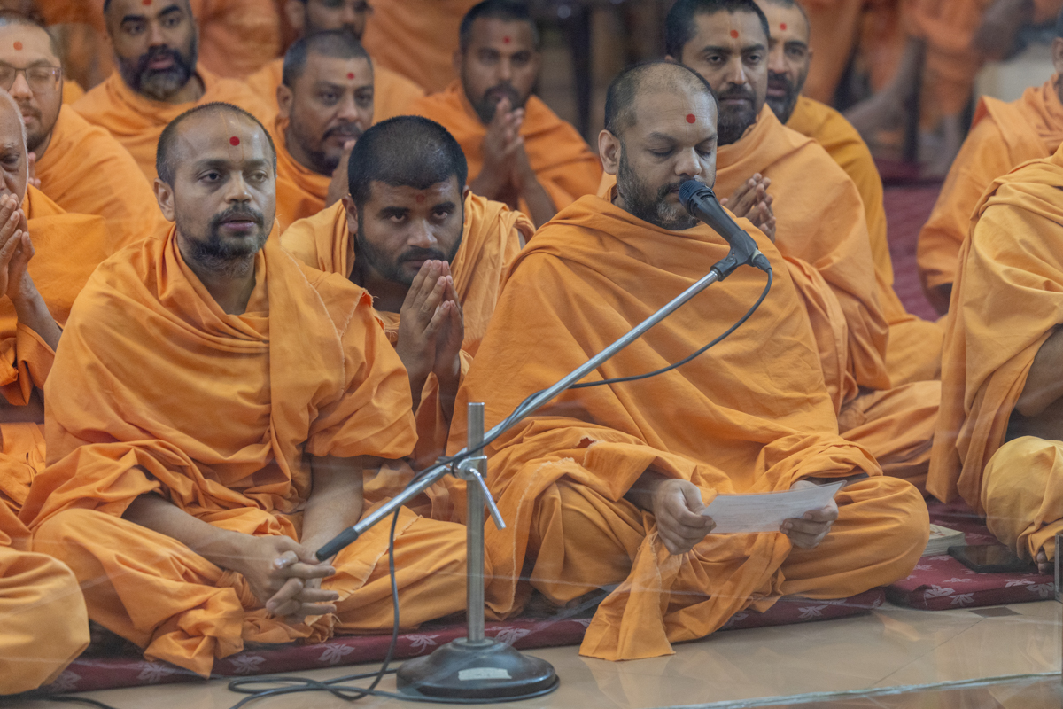A swami leads everyone in reciting the sadhana mantra and daily prayer in Swamishri's puja