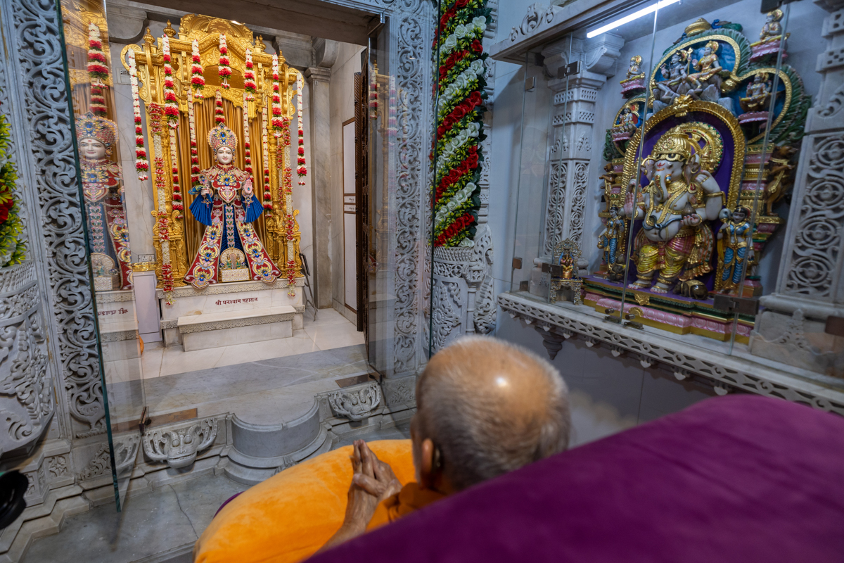 Swamishri engrossed in darshan of Shri Ghanshyam Maharaj