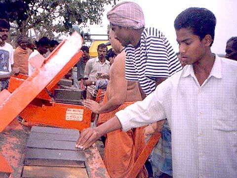 Sadhus perform pujan of machinery to be used in the reconstruction process