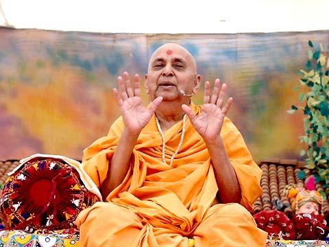 The assembly was blessed with a divine discourse from Swamishri. Swamishri explained the glory and compassion of Lord Swaminarayan who took a human form on earth solely to redeem countless souls. Swamishri added, "God wishes the good of all. There is no fault in God and his holy sadhu. We must have faith in his divinity and glory..."