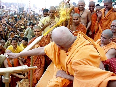 The crowning glory of the festival - Swamishri sprays the sanctified colored water on the elated devotees