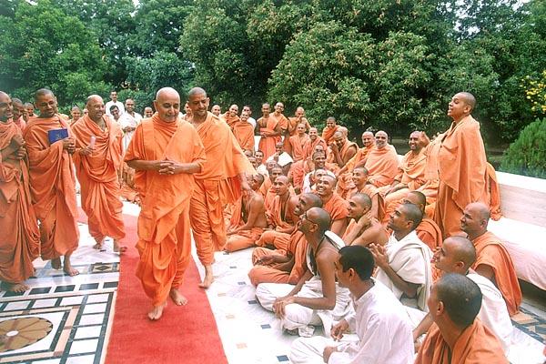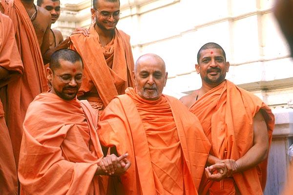 Swamishri shares a light moment with sadhus while circumambulating the Yagnapurush Smruti Mandir