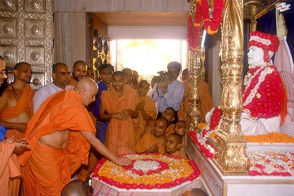 Swamishri reverentially touches the palanquin that carried Shastriji Maharaj's body for the last rites