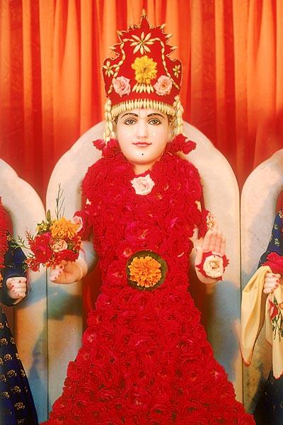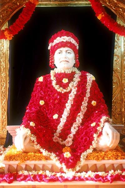 Shastriji Maharaj's murti decked with flowers on the day of Shraddh, Smruti Mandir