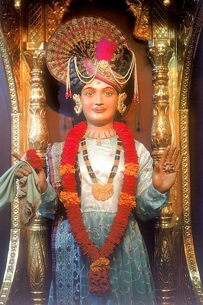 Shri Harikrishna Maharaj beautifully adorned with necklaces and jewellery