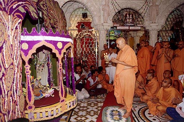 Swamishri performs arti of Shri Harikrishna Maharaj seated in hindolo