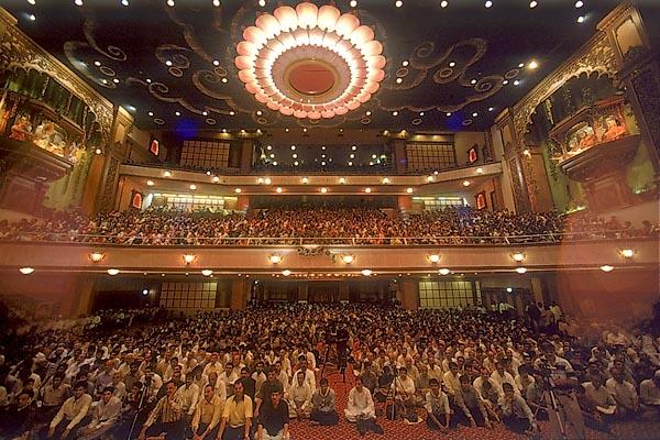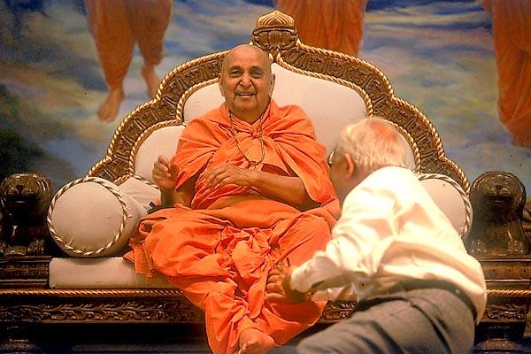 A large painting in the backdrop of Swamishri depicts Bhagwan Swaminarayan, Guru Parampara and mandirs