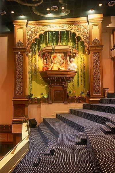 Murti of Yogiji Maharaj in a blessing pose forms part of the stage facade