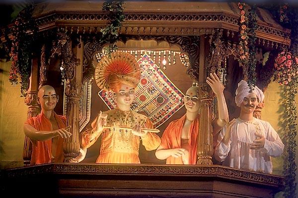 Flanking the Yogi Sabhagruh walls are the murtis of Bhagwan Swaminarayan, Pramukh Swami Maharaj, sadhus and devotees in the divine mood of rangotsav (festival of color)