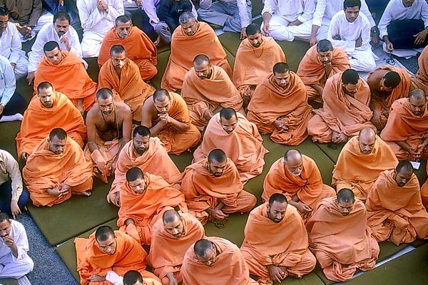 Students of BAPS Naimisharanya Gurukul sing bhajans during the puja while Swamishri is engrossed in his puja on the mandir precincts