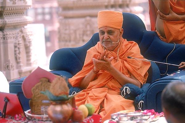 Swamishri performs pujan of the Barsakh pillar amidst Vedic chanting in the presences of sadhus and devotees. After the rituals Swamishri blessed the small assembly of sadhus and devotees and then observed the inner construction of the monument.