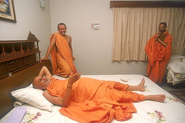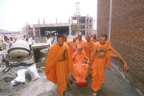 Swamishri on an observation tour of the under-construction Akshardham complex.