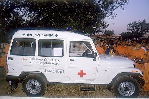 At the renowned BAPS gaushala in Sarangpur, Swamishri inaugurates the new office, mobile medical van and clinic for animals