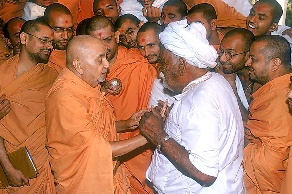 Swamishri meets Shri Virjibhai who had offered his services during the construction of Sarangpur and Gondal mandirs