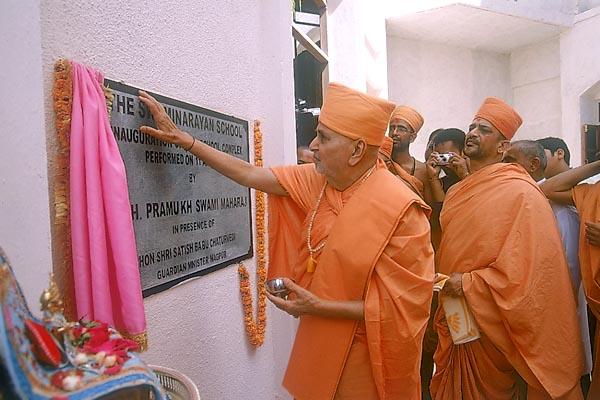 Swamishri performs pratishtha of Shri Akshar Purushottam Maharaj in the school prayer hall