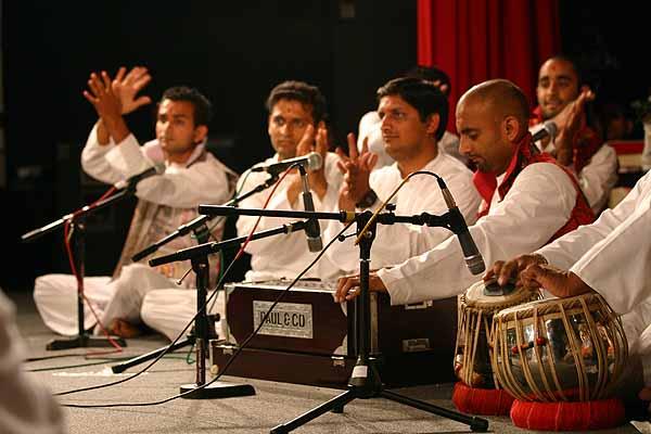 Yuvaks sing a kirtan in qawali style during the evening assembly
