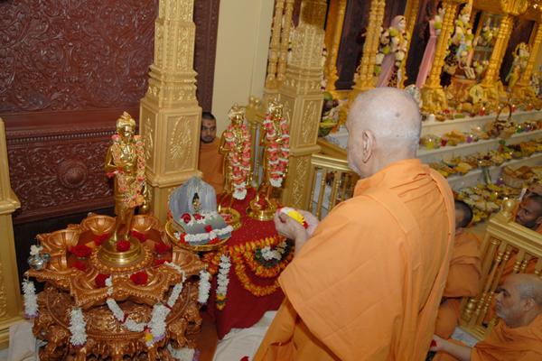Senior sadhus and devotees perform murti-pratishtha mahapuja