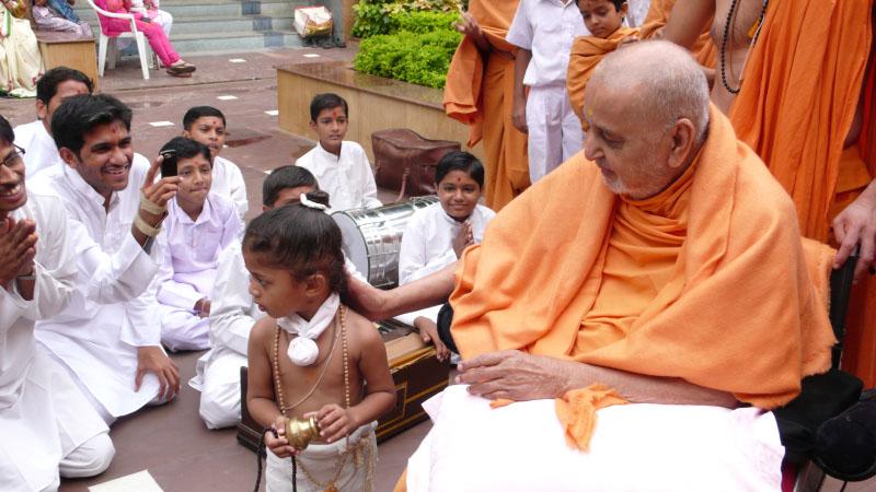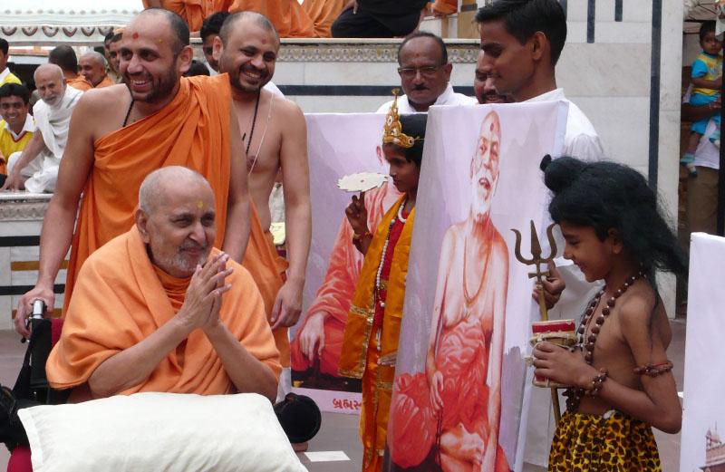 Swamishri bids Jai Swaminarayan to all while children perform a traditional dance