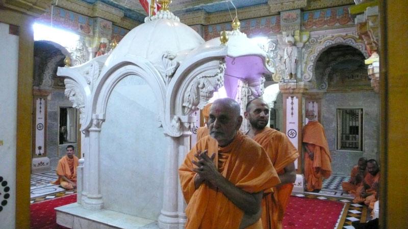 Swamishri engaged in darshan and performing pradakshina at Akshar Deri